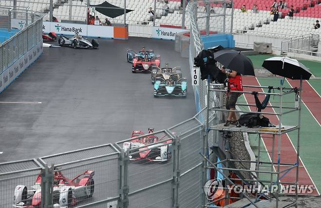 (서울=연합뉴스) 홍해인 기자 = 13일 서울 송파구 잠실올림픽주경기장에서 열린 '2022 하나은행 서울 E-프리(E-Prix)' 15라운드 경기에서 경주차들이 주경기장 내 트랙을 달리고 있다. 2022.8.13