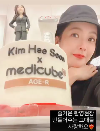 공개된 사진 속 김희선은 스태프들이 직접 주문 제작한 케이크와 함께 셀카를 찍는 모습이 담겨있다.