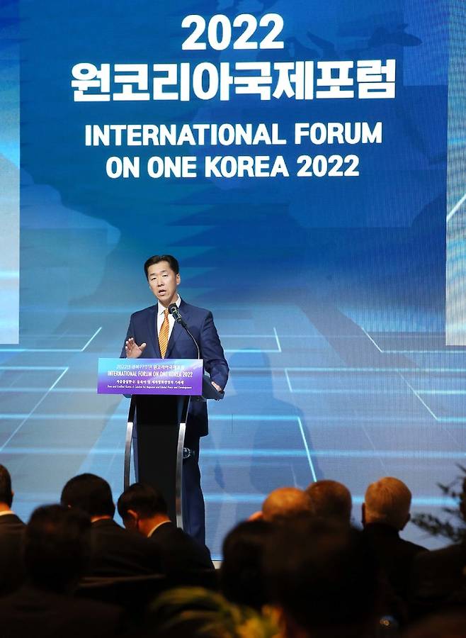 [서울=뉴시스] 조수정 기자 = 문현진 글로벌피스재단 창설자 겸 세계의장이 13일 서울 여의도 페어몬트 호텔에서 개막한 ‘2022 원코리아국제포럼(International Forum On ONE KOREA)’에서 기조연설하고 있다. 이번 포럼은 ‘자유통일한국: 동북아 및 세계평화 번영의 기폭제’를 주제로 국제 사회에서 한반도 위기의 해법을 모색한다. 글로벌피스재단(GPF), 통일을실천하는사람들(AKU), 대한민국헌정회, 대한민국재향경우회, 대한노인회, 한국예술문화단체총연합회(한국예총), 원코리아재단, 한반도통일지도자총연합(LAKU)가 공동주최한다. (사진=2022원코리아국제포럼 제공) 2022.08.13. photo@newsis.com *재판매 및 DB 금지