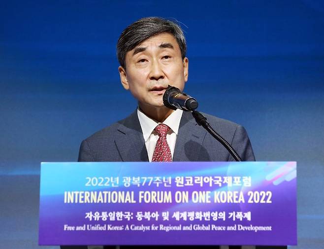 [서울=뉴시스] 조수정 기자 = 이종걸 민족화해협력범국민협의회 대표상임의장이 13일 서울 여의도 페어몬트 호텔에서 개막한 ‘2022 원코리아국제포럼(International Forum On ONE KOREA)’에서 축사하고 있다. 이번 포럼은 ‘자유통일한국: 동북아 및 세계평화 번영의 기폭제’를 주제로 국제 사회에서 한반도 위기의 해법을 모색한다. 글로벌피스재단(GPF), 통일을실천하는사람들(AKU), 대한민국헌정회, 대한민국재향경우회, 대한노인회, 한국예술문화단체총연합회(한국예총), 원코리아재단, 한반도통일지도자총연합(LAKU)가 공동주최한다. (사진=2022원코리아국제포럼 제공) 2022.08.13. photo@newsis.com *재판매 및 DB 금지