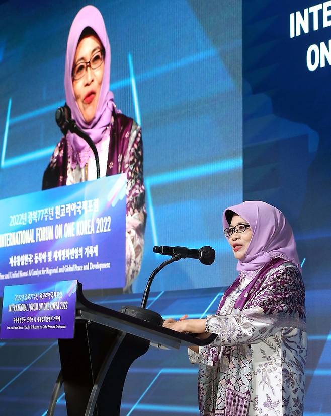 무스다 물리아 물라아라야재단 설립자가 13일 서울 여의도 페어몬트 호텔에서 개막한 '2022 원코리아국제포럼(International Forum On ONE KOREA)'에서 연설하고 있다.