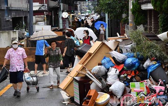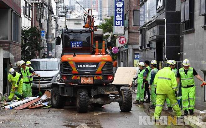 13일 오전 서울 관악구 신사동 일대는 기록적인 폭우로 한순간 삶의 터전을 잃은 수재민들을 위해 수백 명의 자원봉사자들이 모였다. 또 다시 추적추적 내리는 장마비에 봉사자들은 땀과 빗물로 온몸이 젖어 들었지만 서로를 격려하며 쓰레기 수거 및 오물제거, 진흙으로 뒤범벅이 된 집기 세척에 여념이 없다.