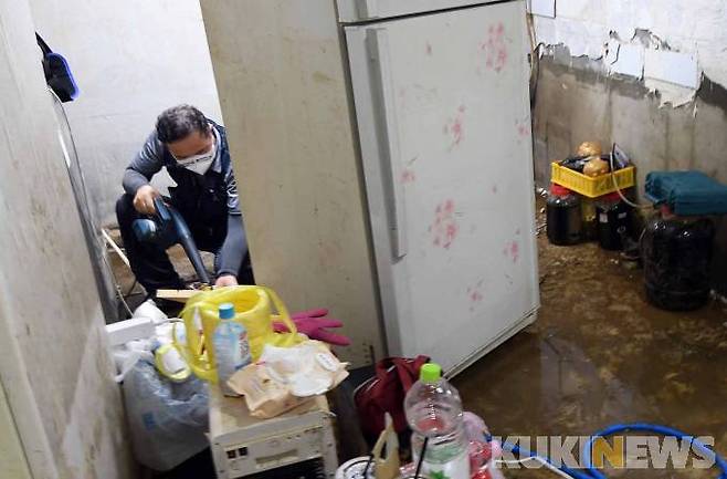 침수피해를 입은 신정태(사진 우측)씨가 삼촌과 함께 물이 빠진 반지하의 방에서 젖은 옷가지를 말리기위해 옷걸이를 만들고 있다.