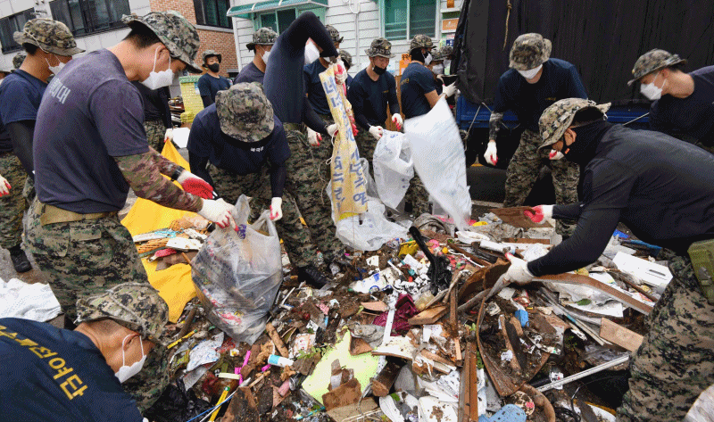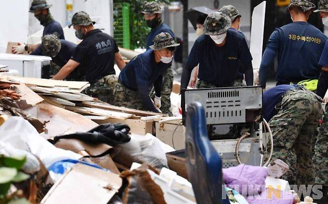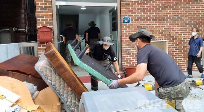 수해 복구 대민 지원에 나선 52사단 햇불여단 장병들이 대규모 수해를 입은 서울 관악구 신대방동에서 침수로 못 쓰게 된 물건들을 정리하고 있다.