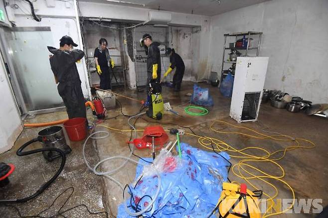 13일 오후 관악구 신사로 10길 양의문교회 입구에서 이 교회 신도들이 지하 교회에서 꺼낸 집기들을 물에 씻고 있다.