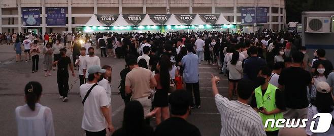 (전주=뉴스1) 유경석 기자 = 2022 전주 가맥축제 마지막 날인 13일 전북 전주시 종합경기장 내 야구장에 마련된 행사장을 찾은 시민과 관광객들이 입장을 위해 줄지어 서 있다. 2022.8.13/뉴스1