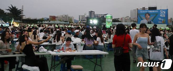 (전주=뉴스1) 유경석 기자 = 2022 전주 가맥축제 마지막 날인 13일 전북 전주시 종합경기장 내 야구장을 찾은 시민과 관광객들이 가맥(가게맥주)을 즐기고 있다. 2022.8.13/뉴스1