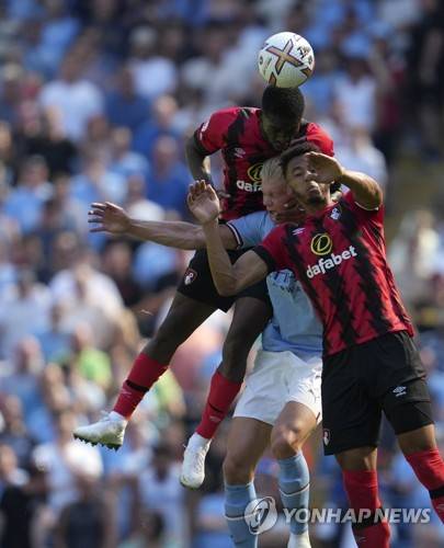 Manchester City's Kevin De Bruyne, center, duels for the ball with Bournemouth's Jefferson Lerma, left, and Bournemouth's Lloyd Kelly during the English Premier League soccer match between Manchester City and Bournemouth at Etihad stadium in Manchester, England, Saturday, Aug. 13, 2022. (AP Photo/Jon Super)