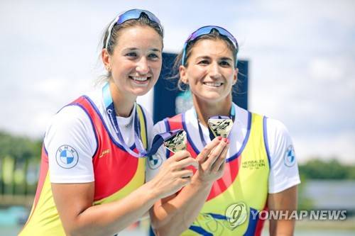 epa10118827 Ancuta BODNAR and Simona RADIS of Romania celebrate at the medal ceremony of the Women's Double Sculls Final A of the Rowing events at the European Championships Munich 2022, Munich, Germany, 13 August 2022. EPA/LEONHARD SIMON