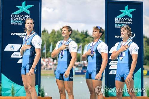 epa10118822 Nicolo? CARUCCI, Andrea PANIZZA, Luca CHIUMENTO, and Giacomo GENTILI of Italy celebrate at the medal ceremony of the Men's Quadruple Sculls Final A of the Rowing events at the European Championships Munich 2022, Munich, Germany, 13 August 2022. EPA/LEONHARD SIMON