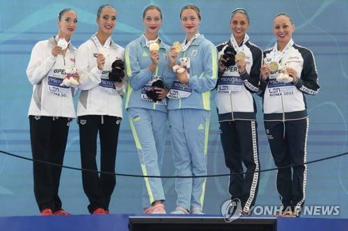 From left, second placed Austria's Vasiliki Alexandri, Anna-Maria Alexandri, first placed Ukraine's Maryna Aleksiiva, Vladyslava Aleksiiva and third placed Italy's Domiziana Cavanna, Costanza Ferro celebrate on the podium at the end of the duet free final at the European swimming championships, in Rome, Saturday, Aug. 13, 2022. (AP Photo/Andrew Medichini)