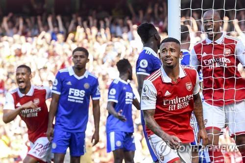 epa10118825 Gabriel Jesus (R) of Arsenal celebrates after scoring teamÕs second goal during the English Premier League soccer match between Arsenal FC and Leicester City in London, Britain, 13 August 2022. EPA/ANDY RAIN EDITORIAL USE ONLY. No use with unauthorized audio, video, data, fixture lists, club/league logos or 'live' services. Online in-match use limited to 120 images, no video emulation. No use in betting, games or single club/league/player publications