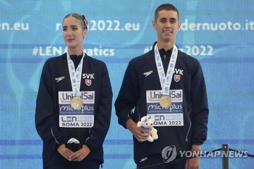 Third placed Italy's Giorgio Minisini, Lucrezia Ruggiero celebrate on the podium at the end of the mixed duet free final at the European swimming championships, in Rome, Saturday, Aug. 13, 2022. (AP Photo/Andrew Medichini)