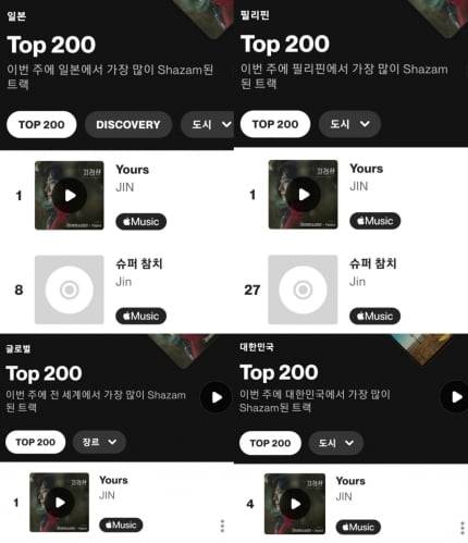 진의 'Yours'는 세계 최대 음원 검색 플랫폼 샤잠(Shazam)에서도 신기록을 경신하며 '솔로 아티스트 JIN'의 저력을 빛냈다.