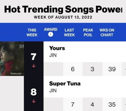 진의 'Yours'(유어스)와 '슈퍼 참치'는 8월 10일 빌보드 차트가 발표한 '핫 트렌딩 송즈 주간 차트' (Billboard Hot Trending Songs Chart-weekly/8월 13일자)에서 각각 7위와 8위에 오르며 막강한 음원 파워를 보여줬다.
