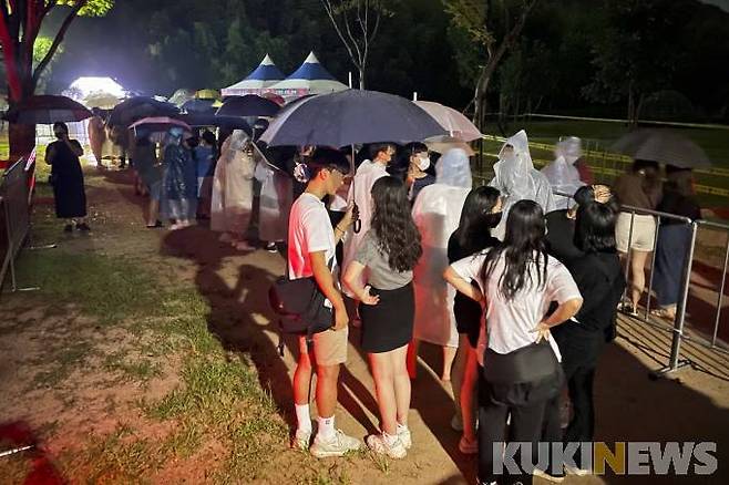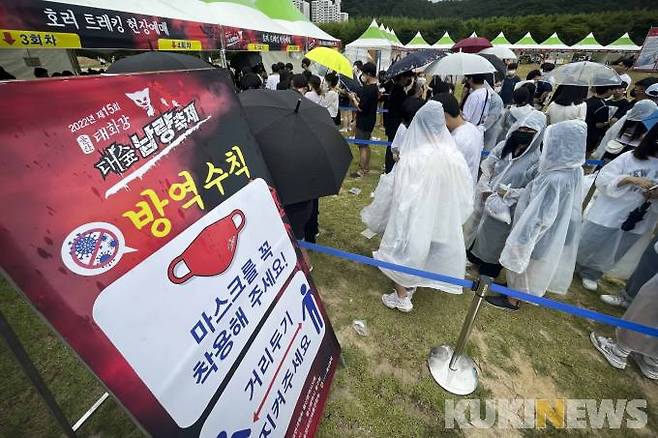 13일 오후 울산 중구 태화강국가정원에서 야외공연장에서 열린 '제15회 울산시 태화강 대숲 납량축제'를 찾은 관람객들이 호러 트레킹 체험 표를 예매하기 위해 오후 4시부터 줄을 서고 있다.