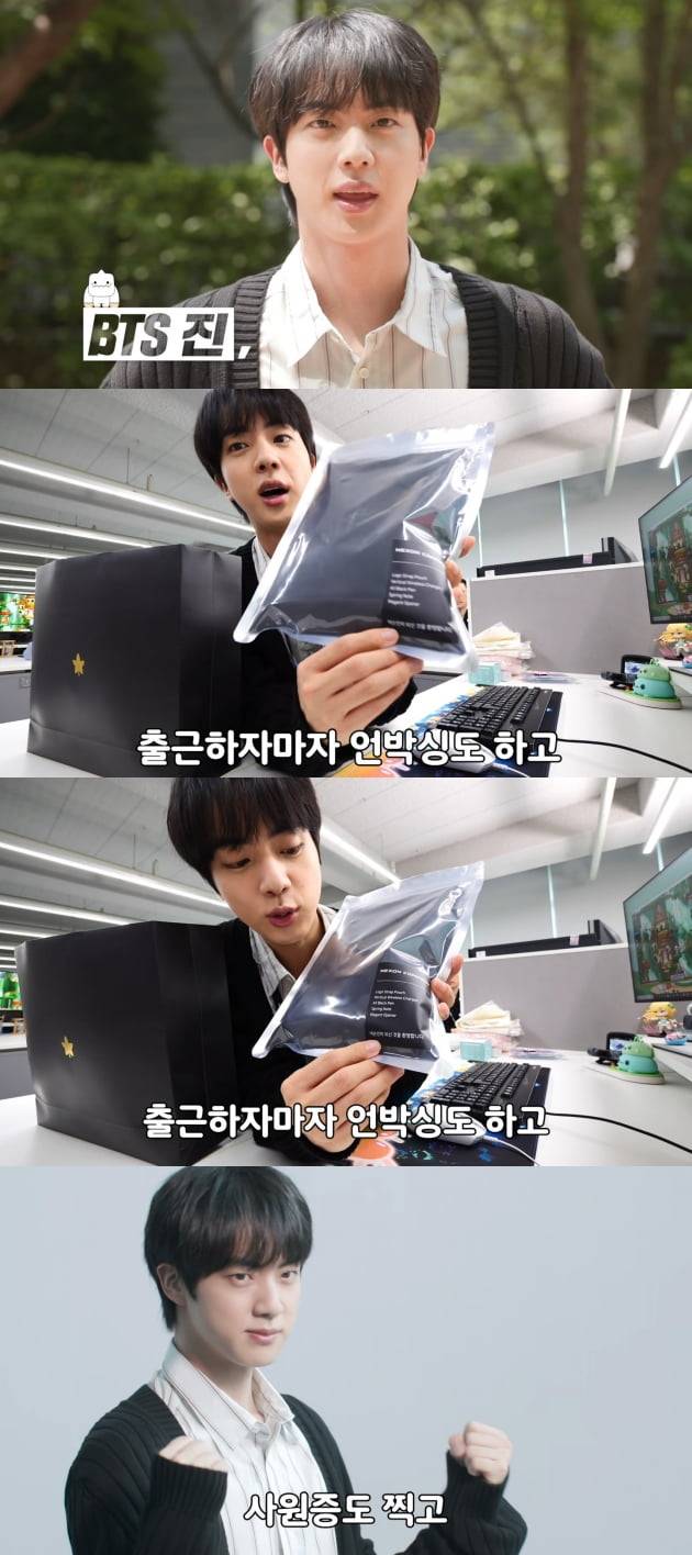 진은 똘망똘망한 눈빛과 정확한 딕션, 자신감 넘치는 목소리로 열혈 신입사원의 모습을 보여주다 장난스러운 표정으로 “퇴사하겠습니다”라고 말해 주변을 웃음바다로 만들었다.