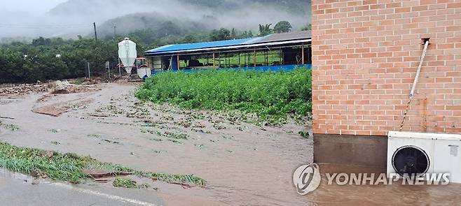 (청양=연합뉴스) 충남 청양군에 집중호우가 내린 14일 오전 장평면 화산2리 도로변 밭이 물에 잠겨 있다. 2022.8.14 [독자 제공. 재판매 및 DB 금지]