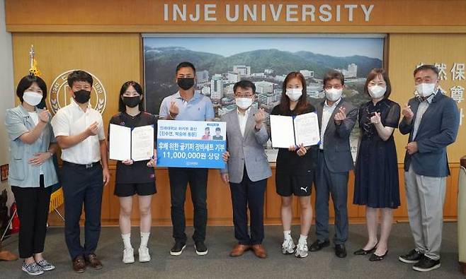전민현 총장은 이들 두 선수에게 감사패를 전하며 "두 선수의 빛나는 활약이 모교와 후배들에게 좋은 본보기가 되고 있다. 인제대의 명예를 높이는 체육부 학생들이 우수한 국가대표 선수로 성장하기를 바라는 마음에서 물심양면으로 지원하겠다"고 말했다.