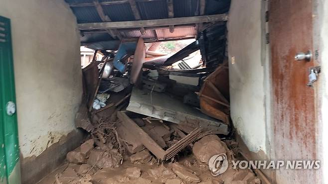 (청양=연합뉴스) 충남 청양군에 집중호우가 내린 14일 오전 장평면 화산리 한 주택에 인근 지역에서 밀려온 폐자재와 돌, 나무뿌리 등이 쌓여 있다. 2022.8.14 [독자 제공. 재판매 및 DB 금지]