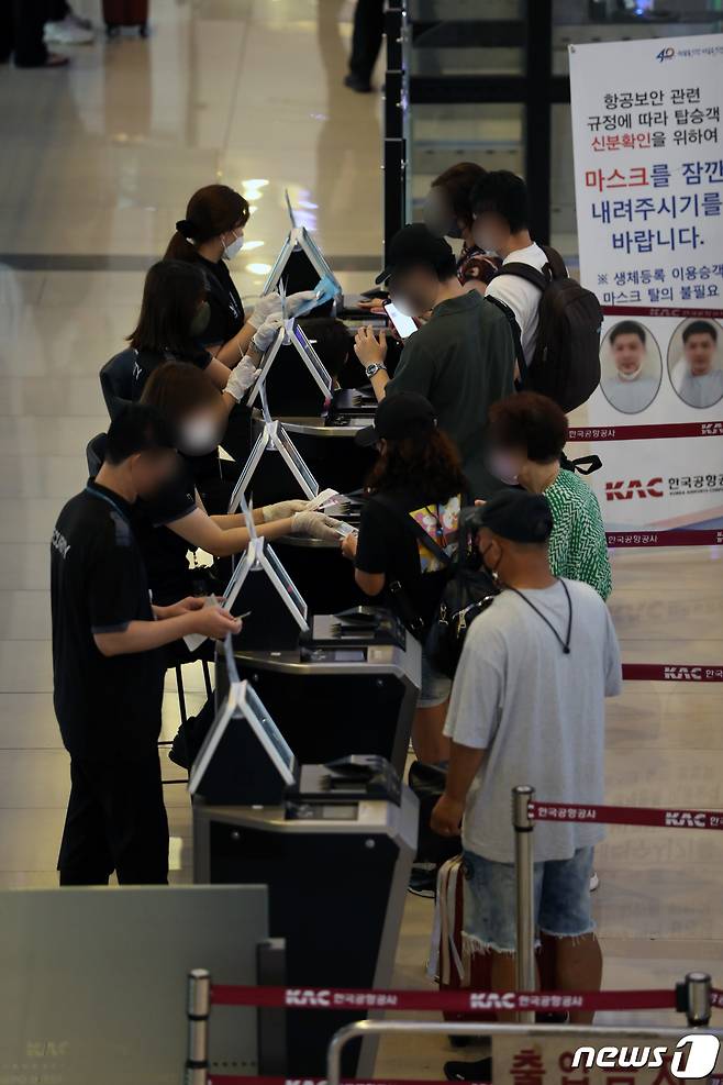 (김포공항=뉴스1) 정진욱 기자 = 광복절을 하루 앞둔 14일 서울 강서구 김포공항 국내선 청사가 막바지 휴가를 떠나는 여행객들로 붐비고 있다. 2022.8.14/뉴스1