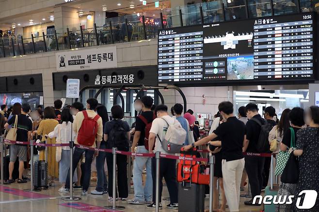 (김포공항=뉴스1) 정진욱 기자 = 광복절을 하루 앞둔 14일 서울 강서구 김포공항 국내선 청사가 막바지 휴가를 떠나는 여행객들로 붐비고 있다. 2022.8.14/뉴스1