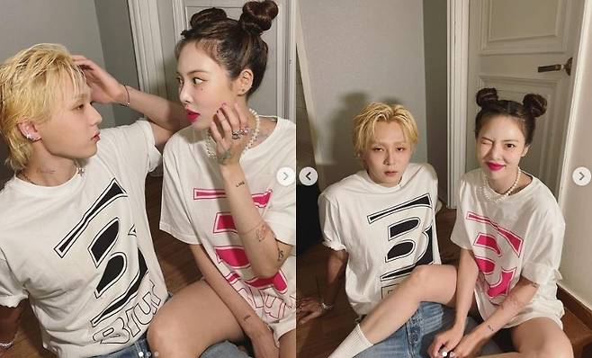 사진에는 현아와 던이 커플룩 패션을 하고 포즈를 취하고 있는 모습이 담겨있다. 금발머리에 화이트 티셔츠, 청바지를 멋을 낸 던과 귀여운 헤어스타일에 하의실종 룩으로 깜찍함과 섹시함을 드러낸 현아의 달달한 커플 투샷이 눈길을 사로잡는다.