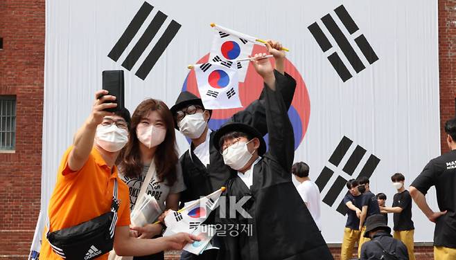 광복절을 하루앞둔 주말인 14일 서대문구 서대문형무소를 찾은 가족이 독립투사 옷을 입고 태극기를 들고 기념촬영을 하고 있다.