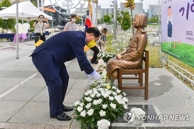 (속초=연합뉴스) 14일 속초 청초호수공원 평화의 소녀상 앞에서 열린 2022년 일본군 위안부 피해자 기림의 날 행사에서 이병선 속초시장이 헌화하고 있다. 2022.8.14 [속초시 제공. 재판매 및 DB 금지]
