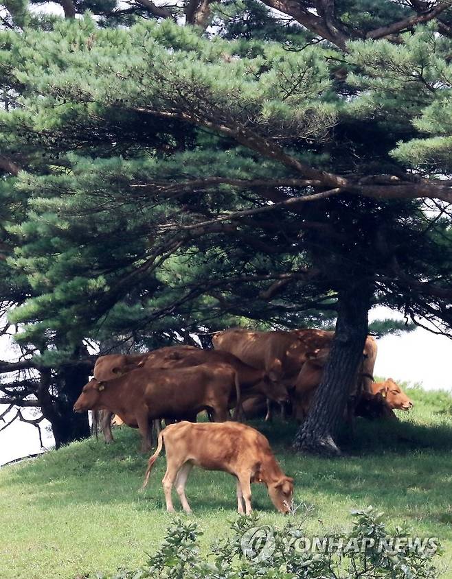 (평창=연합뉴스) 유형재 기자 = 14일 강원 평창군 대관령의 한 목장 초지에서 한우들이 뜨거운 햇볕을 피해 소나무 그늘에서 쉬고 있다. 2022.8.14