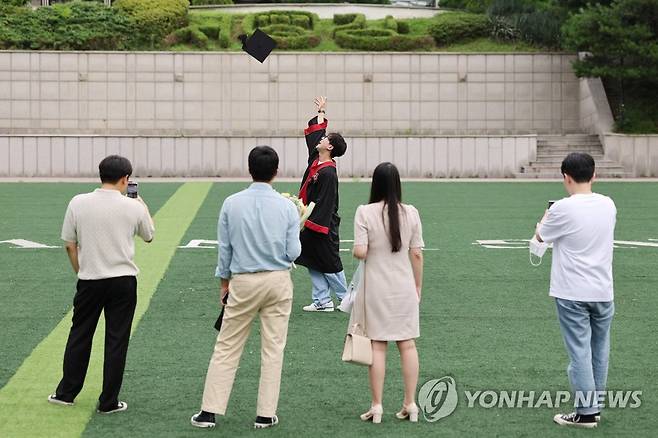 (서울=연합뉴스) 임화영 기자 = 14일 오후 하계졸업식을 사흘 앞둔 서울 마포구 서강대학교에서 졸업생이 학사모를 하늘 높이 던지며 기념촬영하고 있다. 2022.8.14