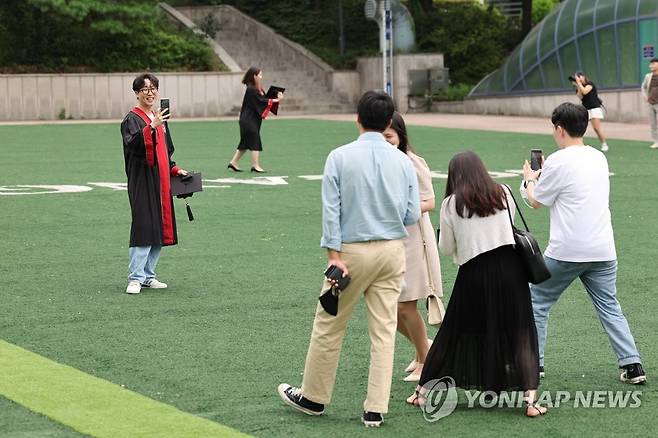 (서울=연합뉴스) 임화영 기자 = 14일 오후 하계졸업식을 사흘 앞둔 서울 마포구 서강대학교에서 졸업생들이 기념사진을 찍고 있다. 2022.8.14