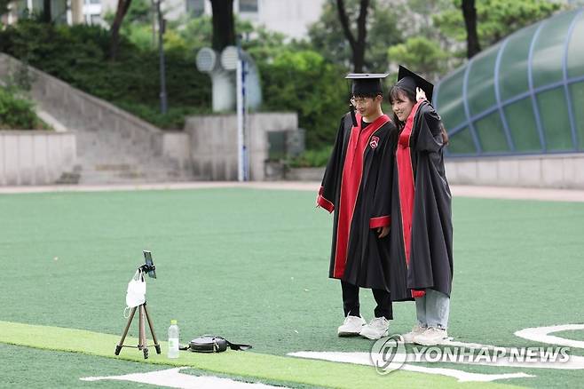 (서울=연합뉴스) 임화영 기자 = 14일 오후 하계졸업식을 사흘 앞둔 서울 마포구 서강대학교에서 졸업생들이 기념사진을 찍고 있다. 2022.8.14