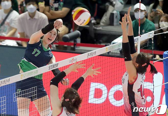 (순천=뉴스1) = 14일 전남 순천 팔마체육관에서 열린 2022 순천 도드람 컵대회 현대건설과 인삼공사의 경기에서 현대건설 고예림이 공격하고 있다. (현대건설 배구단 제공) 2022.8.14/뉴스1