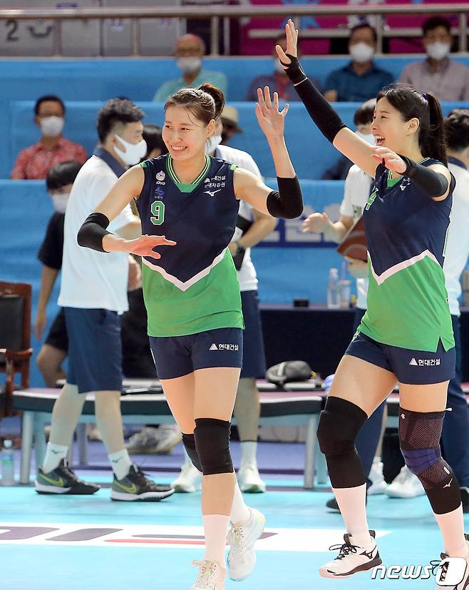 (순천=뉴스1) = 14일 전남 순천 팔마체육관에서 열린 2022 순천 도드람 컵대회 현대건설과 인삼공사의 경기에서 현대건설 나현수와 김주하가 환호하고 있다. (현대건설 배구단 제공) 2022.8.14/뉴스1