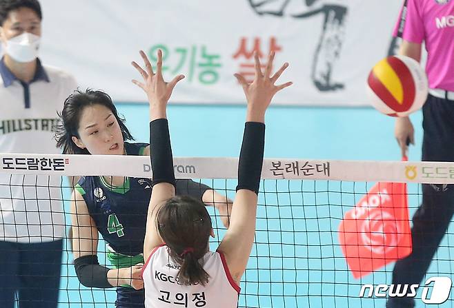 (순천=뉴스1) = 14일 전남 순천 팔마체육관에서 열린 2022 순천 도드람 컵대회 현대건설과 인삼공사의 경기에서 현대건설 황연주가 공격하고 있다. (현대건설 배구단 제공) 2022.8.14/뉴스1