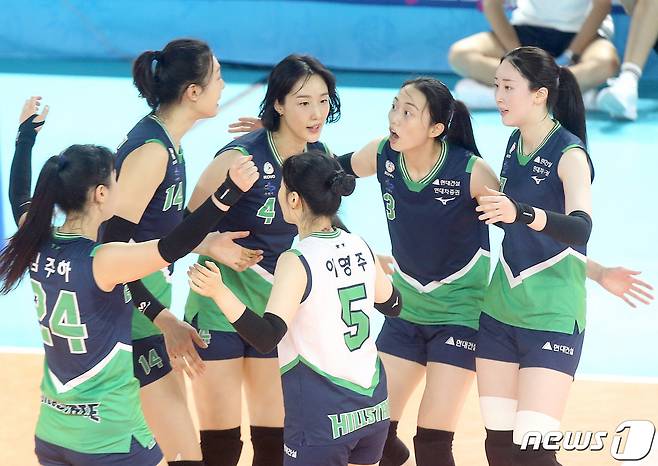 (순천=뉴스1) = 14일 전남 순천 팔마체육관에서 열린 2022 순천 도드람 컵대회 현대건설과 인삼공사의 경기에서 현대건설 선수들이 득점 후 환호하고 있다. (현대건설 배구단 제공) 2022.8.14/뉴스1