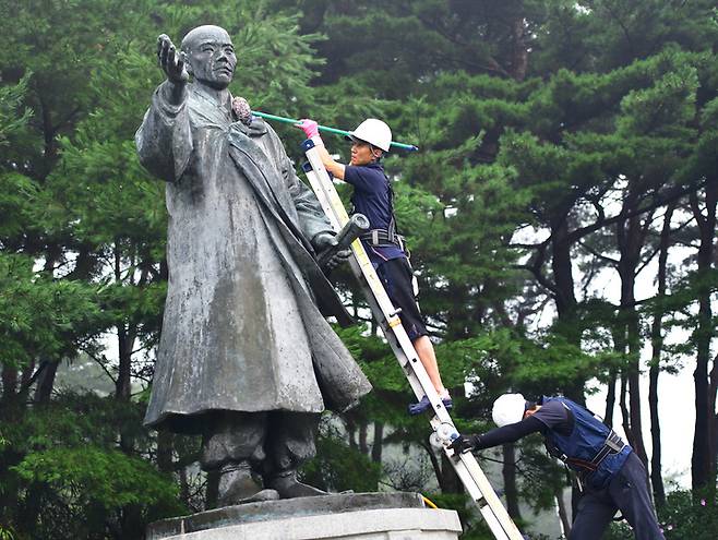 [홍성=뉴시스] 유효상 기자 = 홍성군이 14일 광복절 제77주년 하루 앞두고 고압세척기와 고소작업차를 이용, 백야 김좌진 장군 및 만해 한용운 선생 동상 세척 작업을 진행한 가운데 한용운 선생 동상부터 청소 용역업체 직원들이 그을음과 찌든 때, 새의 배설물, 빗물자국, 이끼 등을 제거하고 하고 있다. (사진=홍성군 제공) 2022.08.14 photo@newsis.com