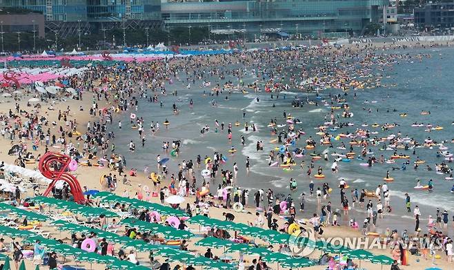 (부산=연합뉴스) 손형주 기자 = 14일 오후 부산 해운대해수욕장이 피서객들로 인산인해를 이루고 있다. 이날 해운대해수욕장은 연휴를 맞아 올해들어 가장 많은 인파가 몰렸다. 2022.8.14