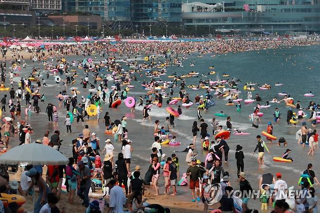 (부산=연합뉴스) 손형주 기자 = 14일 오후 부산 해운대해수욕장이 피서객들로 인산인해를 이루고 있다. 이날 해운대해수욕장은 연휴를 맞아 올해들어 가장 많은 인파가 몰렸다. 2022.8.14