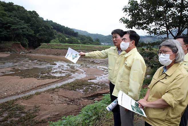 [홍성=뉴시스] 유효상 기자 =김태흠 충남지사가 14일 호우피해를 입은 청양군을 찾아 김돈곤 군수와 김명숙 도의원으로부터 지역 호우피해 현황을 설명듣고 있다. (사진=충남도 제공) 2022.08.14 photo@newsis.com
