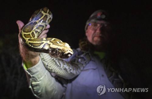 epaselect epa10119834 Thomas Rahill holds a large python he hunted, during the Florida Python Challenge (FPC) 2022 contest, in Holiday Park?s check station, in Fort Lauderdale, Florida, USA, 13 August 2022. The Florida Python Challenge is a Florida state effort to eradicate all pythons, and specifically the invasive Burmese pythons. More than 800 competitors attended the FPC 2022 event, which helps protect the rare everglades habitat from these invasive, non-native snakes. EPA/CRISTOBAL HERRERA-ULASHKEVICH