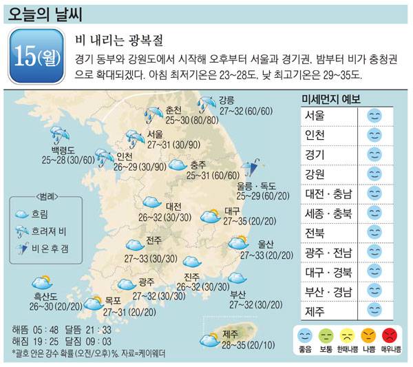[오늘의 날씨] 15일, 비 내리는 광복절