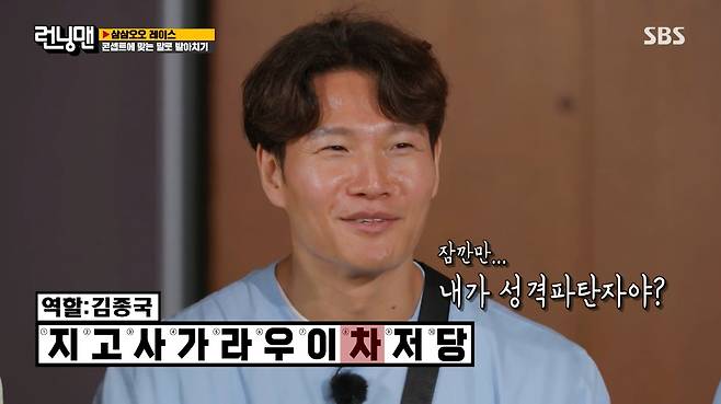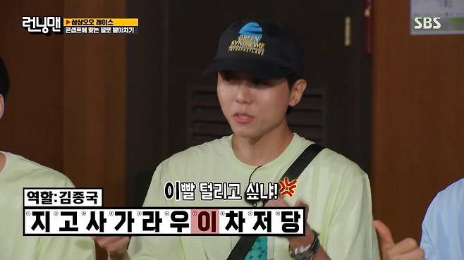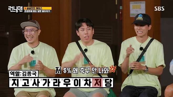 다른 멤버들 또한 '김종국' 제시어에 즐거워했다. 주우재는 "이빨 털리고 싶냐", 지석진은 "차로 꺼져 인마", 양세찬은 "너 왜 축구 안나와 이 XX야!" 등을 외쳤다. 이에 김종국은 "내가 성격 파탄자야?"라며 갸웃거렸다.