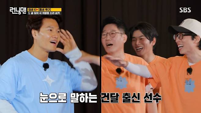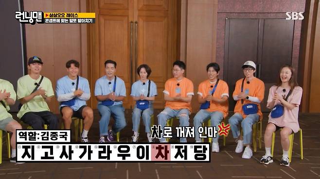 멤버들은 주어진 역할과 상황에 맞는 멘트를 외치는 미션을 진행했다. 제시어로 '김종국'이 주어지자 유재석은 "사랑해 지효야"라고 말했고, 지목 받은 김종국은 "가 인마!"라며 버럭했다.
