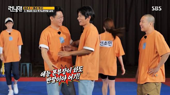 상대편인 이이경 또한 PD에게 존댓말을 하며 감점 되자 지석진은 "여기는 예능 본부장이 와도 반말"이라고 강조했다. '화내지 않고 웃기&존댓말 금지' 미션에서 옵션 실책이 이어지는 가운데 하도권 팀이 승리했다.