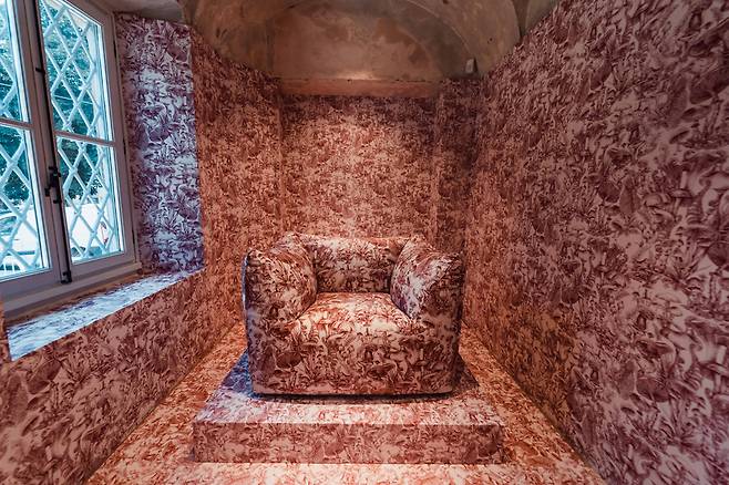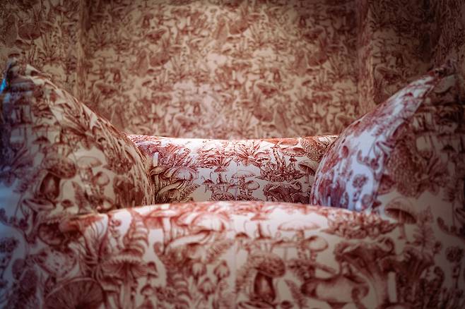 스텔라 매카트니 x 콜&손 – 벽지: 콜&손은 스텔라 매카트니의 2022년 여름 컬렉션 버섯 프린트를 버건디 및 네이비 컬러 벽지로 선보였다.