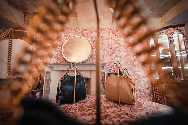 소재 혁신 팝업 스토어: 콜&손 벽지로 장식된 이 공간에서는 윤리적인 소재를 이용한 스텔라 매카트니의 레디-투-웨어와 비건 악세서리를 큐레이팅해 선보였다.