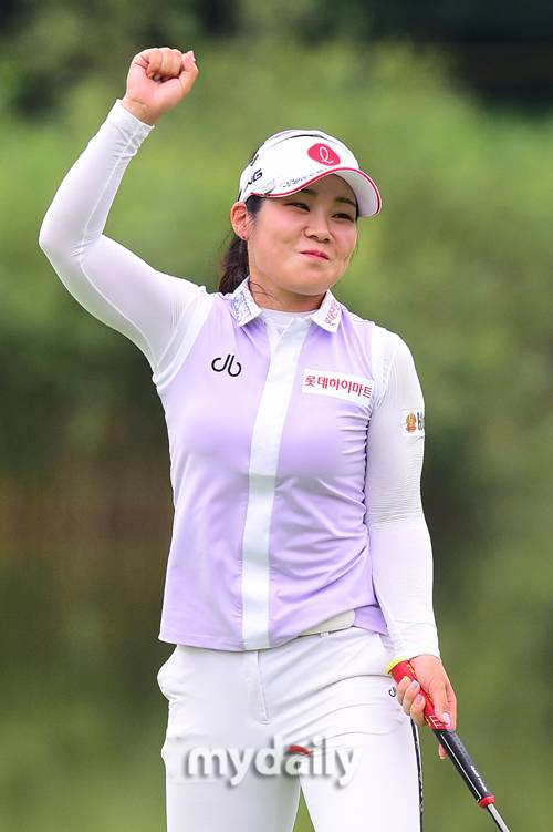 [마이데일리 = 포천 곽경훈 기자] 이소영이 14일 경기도 포천시 대유몽베르 컨트리클럽(파72/6,590야드)에서 진행된 '대유위니아 MBN여자오픈'(총상금 9억 원, 우승상금 1억 6천2백만 원) 3라운드에서 박현경과 2차 연장까지 가는 접전 끝에 시즌 첫 우승을 차지한 뒤 기뻐하고 있다.