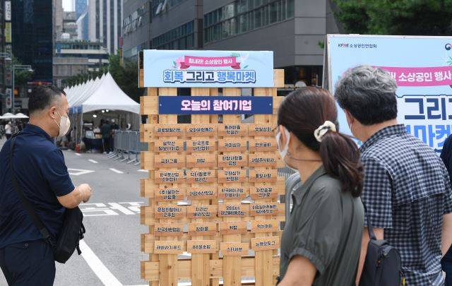 시민들이 14일 서울시청 인근에서 열린 ‘힘내라! 소상공인 장터’ 행사장 입구에서 참여기업 명단을 살펴보고 있다. 중소벤처기업부는 소상공인시장진흥공단과 함께 ‘백년가게 우수제품 전시·판매전’ ‘힘내라! 소상공인 장터’를 개최했다. 광복 77주년 경축행사와 연계해 최근 어려움을 겪고 있는 소상공인 사기진작과 소비촉진을 위해 준비했다. 이한형 기자